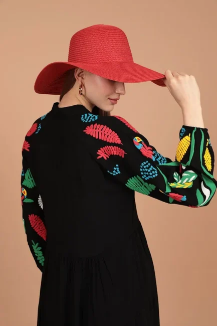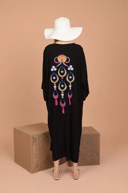 Etnik Nakışlı Detaylı V Yakalı ve Uzun Kollu Uzun Boylu Viskon Kumaşlı Kadın Elbise Siyah Yaz/Bahar