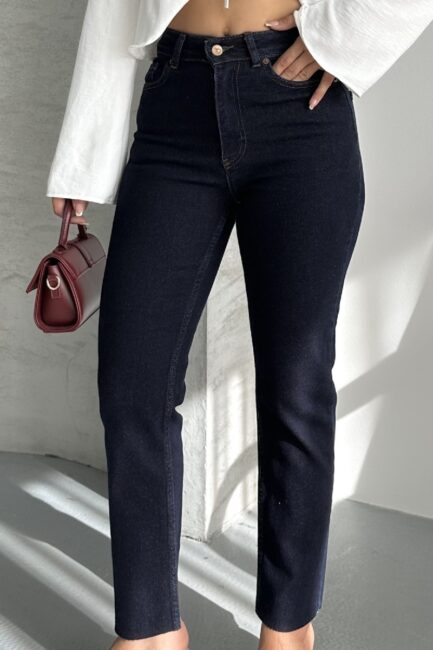 Paçaları Dikişsiz ve Yüksek Belli Kadın Kot Pantolon Mom Fit Jean Lacivert