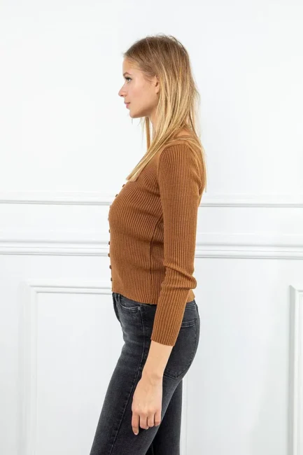 Uzun Kollu ve V Yakalı Triko Kumaşlı Düğmeli Dar Kalıplı Kadın Hırka Kahve