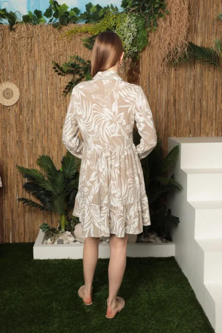 Yaprak Desenli ve Uzun Kollu Viskon Kumaşlı Gömlek Yakalı Kadın Kısa Elbise Bej Yaz Bahar