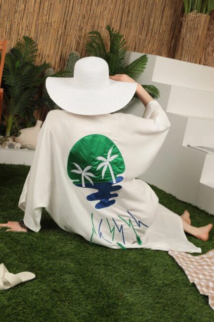Sırtı Nakış Detaylı V Yakalı ve Uzun Kollu Viskon Kumaşlı Bol Kalıplı Kadın Elbise Ekru Yaz / Bahar