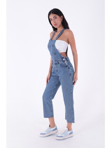 Yanları Düğme Detaylı Dekoratif Cepli Astarsız Mom Fit Kadın Kot Tulum Orta Mavi Denim Dört Mevsim