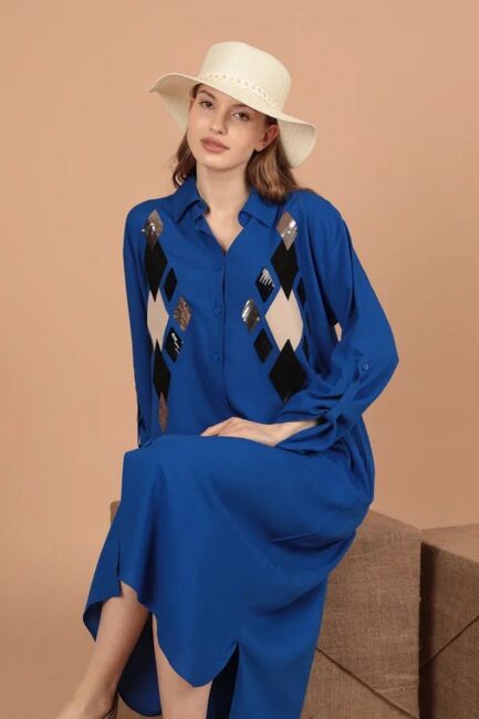 Pulpayet Nakış Detaylı Gömlek Yakalı Uzun Kollu ve Viskon Kumaşlı Kadın Elbise Saks Yaz / Bahar