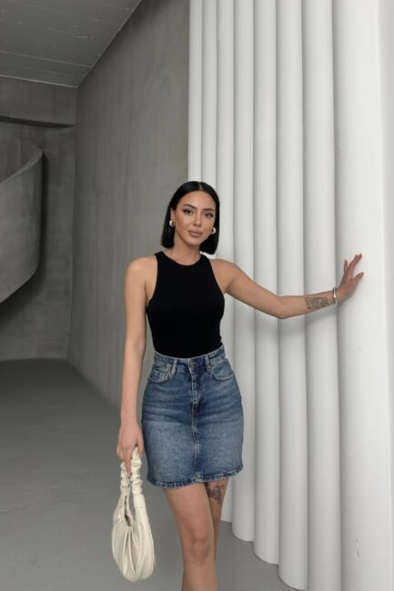 Dar Kalıplı Normal Belli Cepli ve Astarsız Kısa Boy Kadın Kot Etek Mini Slaplı Lacivert Denim