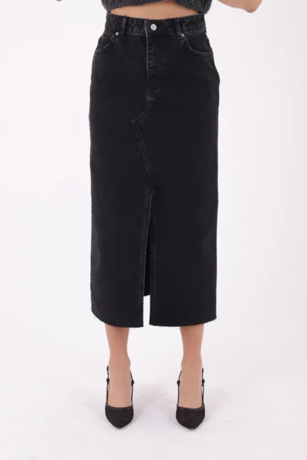 Önü Yırtmaçlı ve Dikiş Detaylı Bitişi Dikişsiz Cepli Astarsız Kadın Kot Etek Normal Antrasit Denim