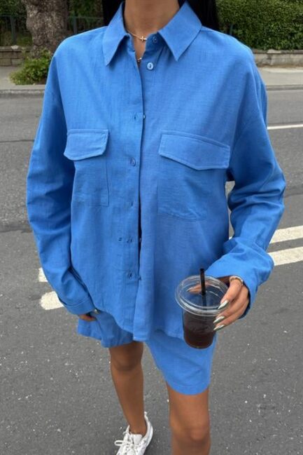 Gömlek Yakalı ve Uzun Kollu Desensiz Flamlı Keten Kadın Gömlek ve Şort Takımı (2 Parça ) MAVİ