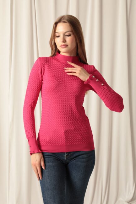 Kolları Düğme Detaylı ve Triko Kumaş Desenli Uzun Kollu Balıkçı Yakalı Kadın Standart Bluz Fuşya