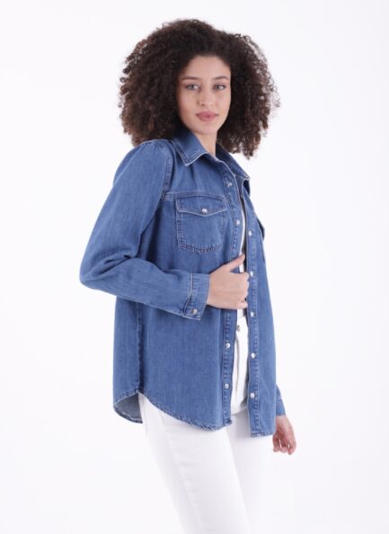 Klasik Yakalı Uzun Kollu Çıtçıt Kapama Detaylı Kadın Kot Gömlek Orta Mavi Denim Dört Mevsim