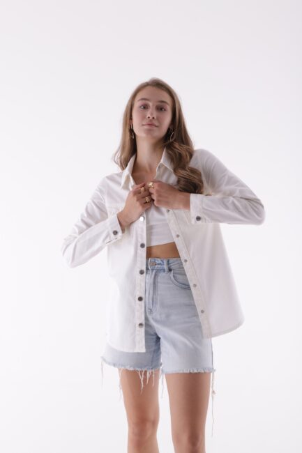 Klasik Yakalı Uzun Kollu Çıtçıt Kapama Detaylı Kadın Kot Gömlek Beyaz Denim Dört Mevsim