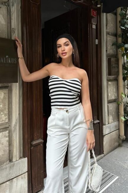 Kolsuz ve Siyah Beyaz Çizgi Desenli Standart Kalıplı Straplez Yakalı Kadın Crop Siyah Beyaz