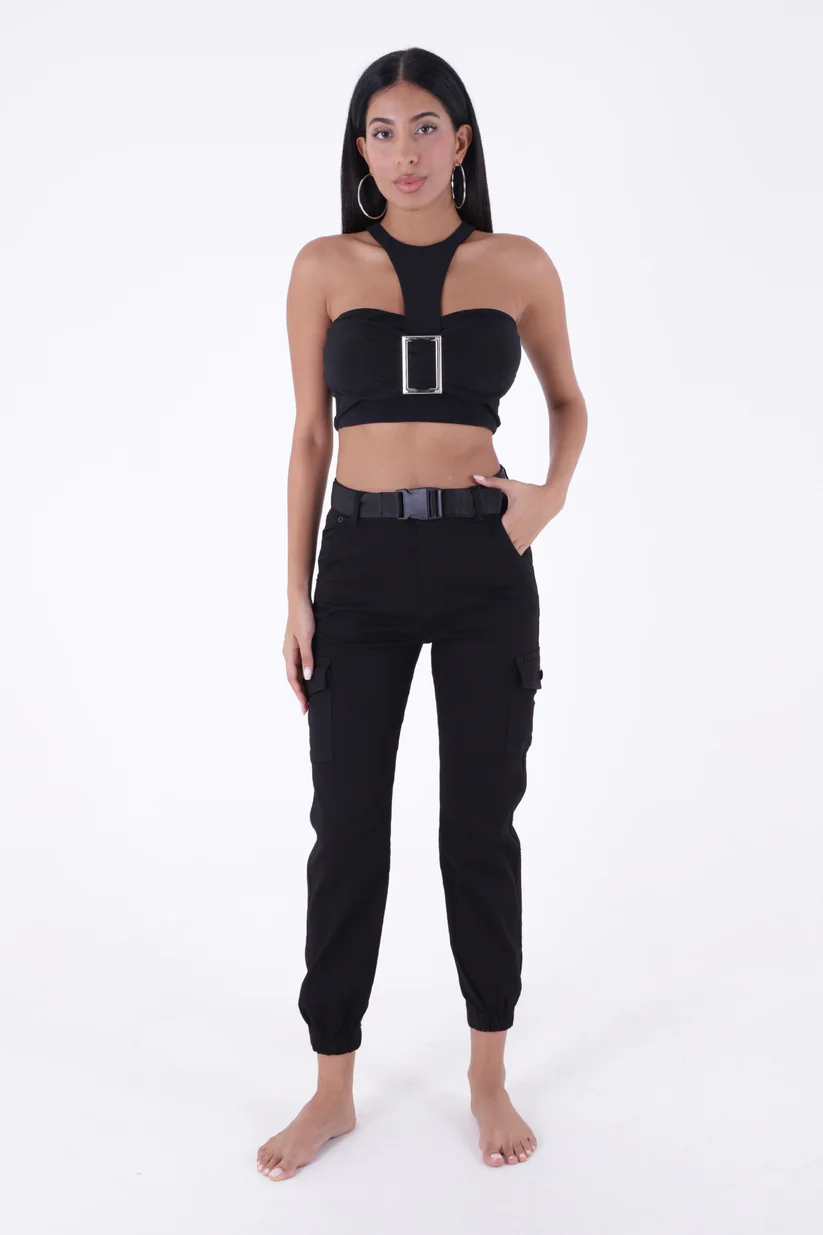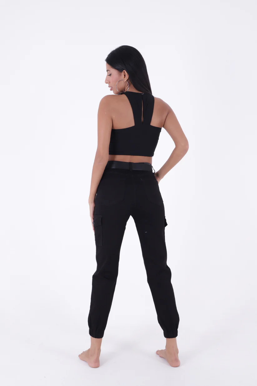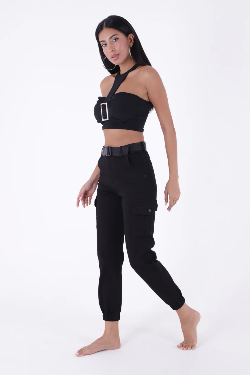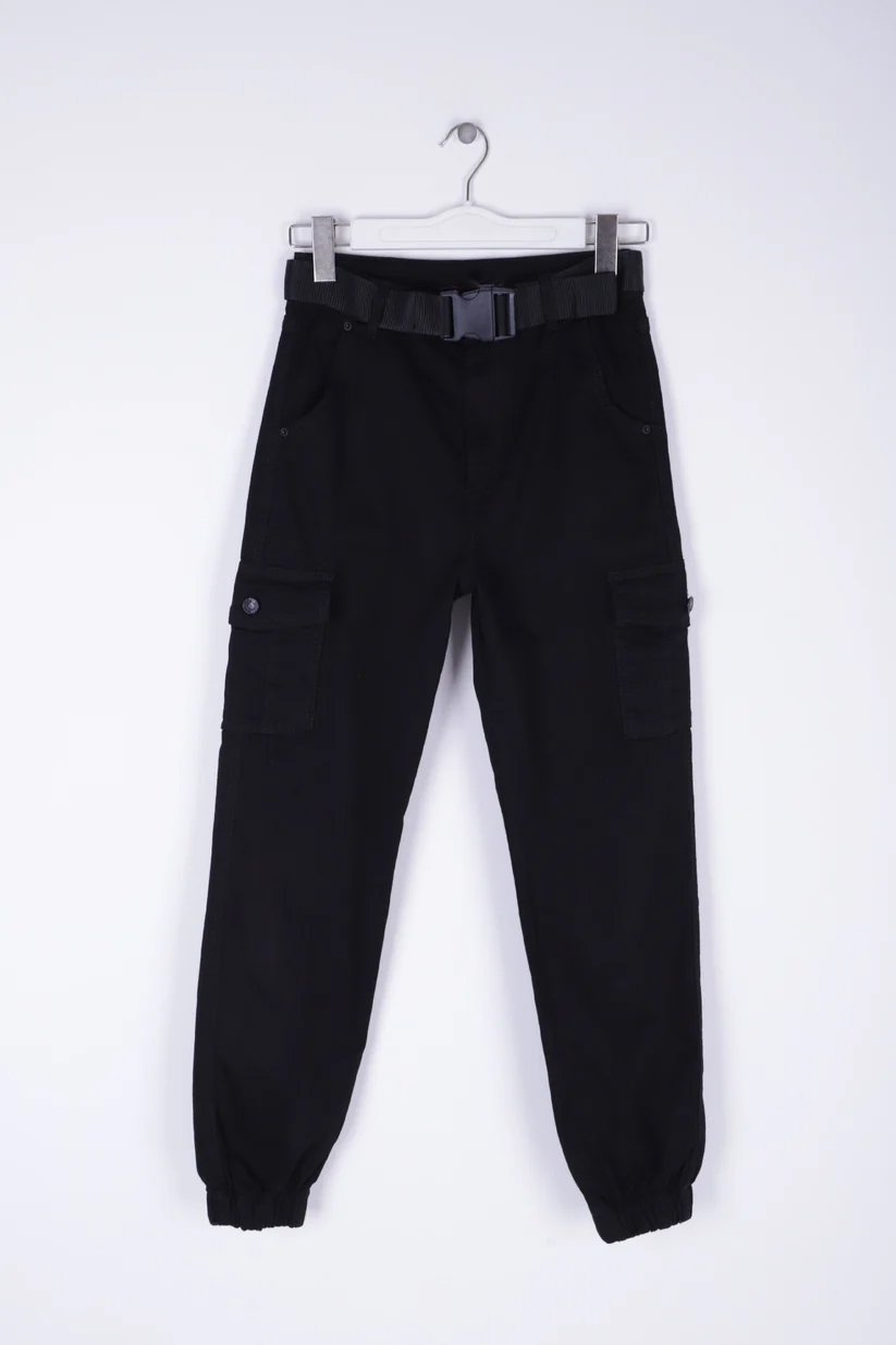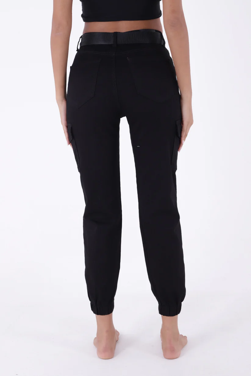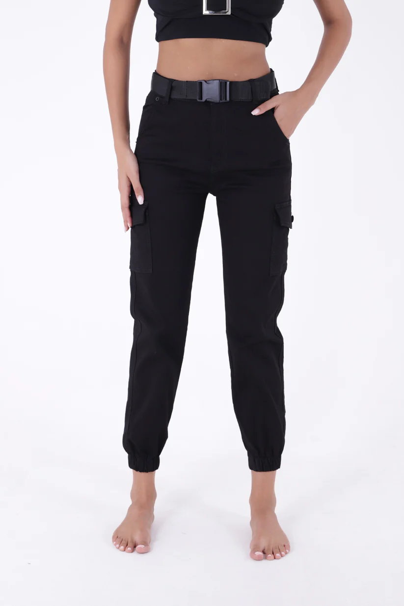 - RichMost Beli Kemerli ve Paçaları Lastikli Komando Tarzı Kargo Cepli Kadın Pantolon SiyahGabardin DörtMevsim