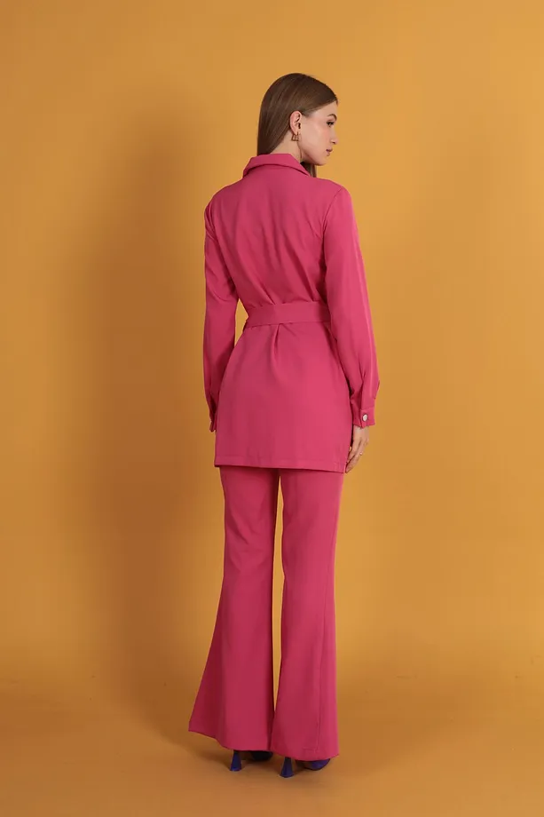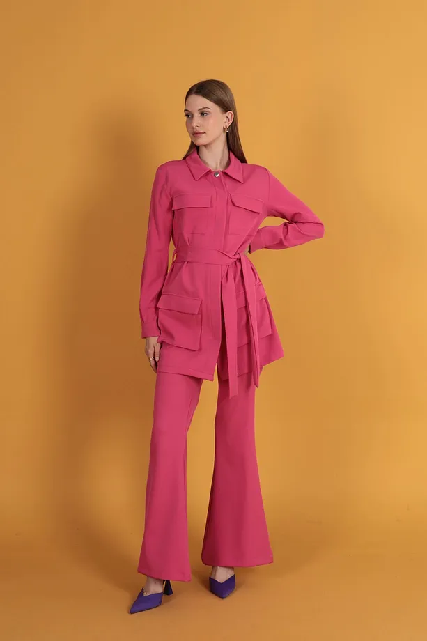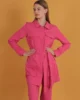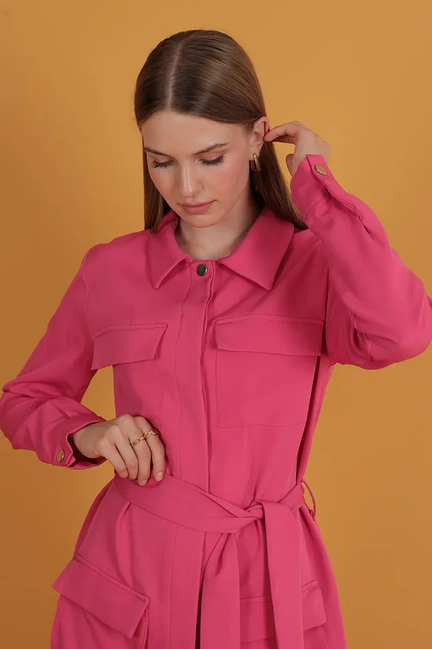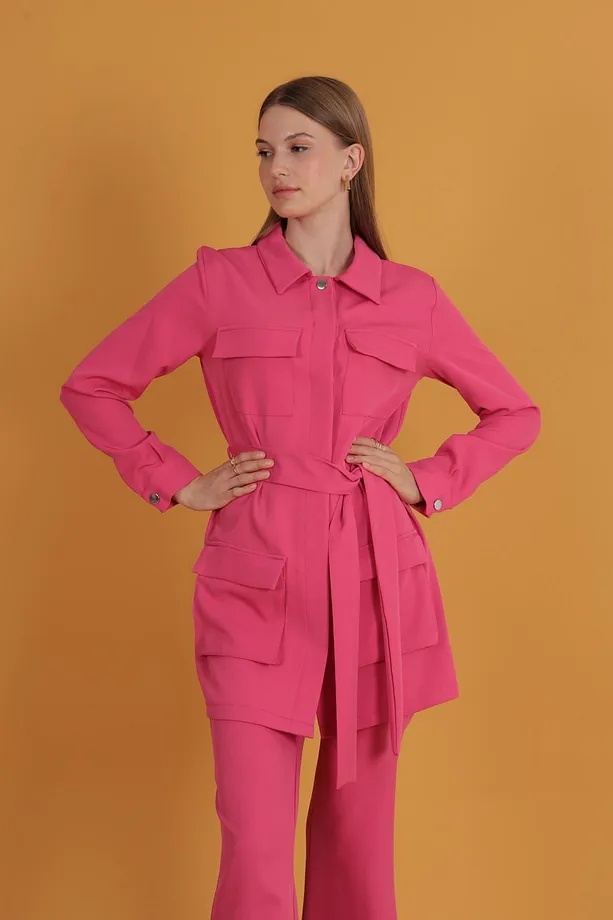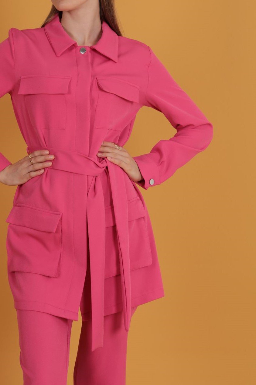 - RichMost Beli Kuşaklı ve Cep Detaylı Uzun Kollu Standart Kalıplı Atlas Kumaşlı Kadın Ceket Pembe