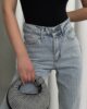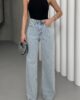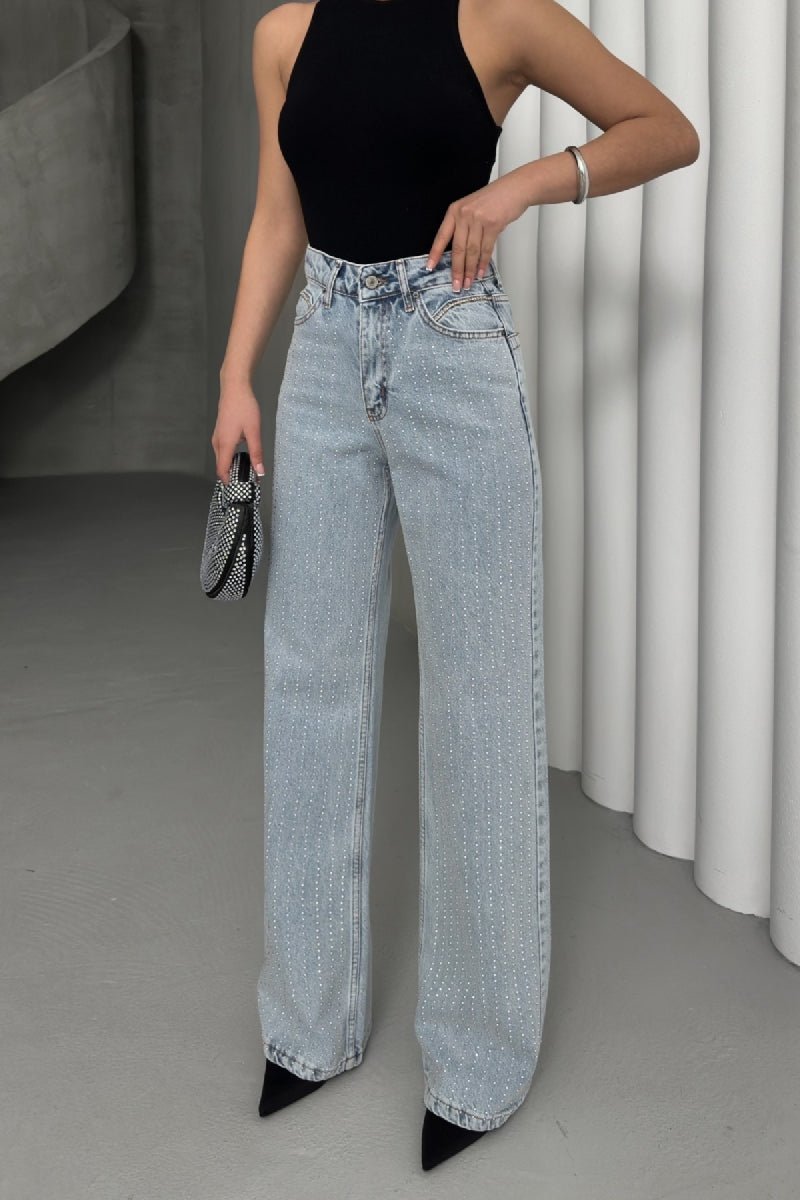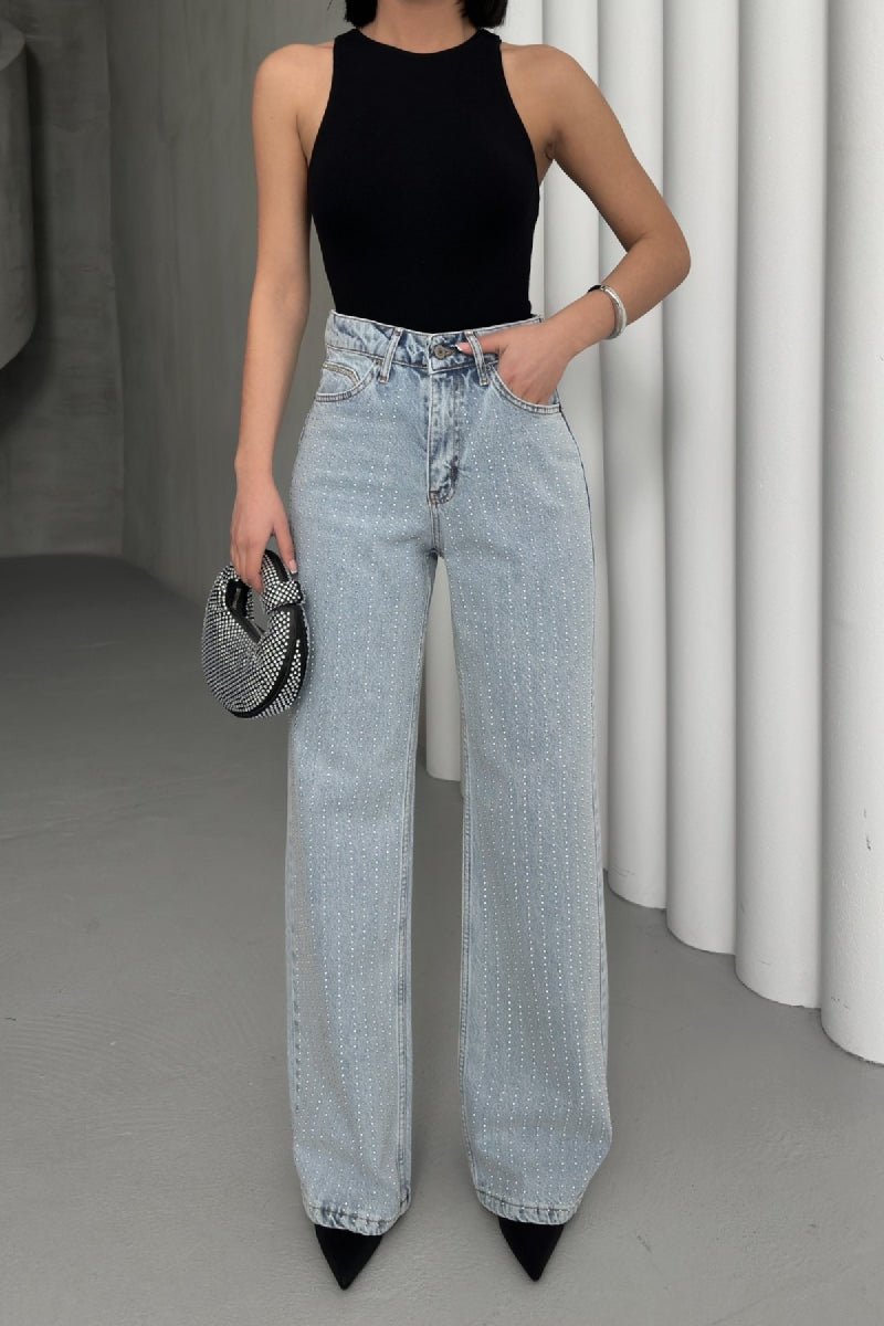 Cep Kenarları Taş Detaylı ve Yüksek Belli Cepli Rahat Kot Kadın Pantolon Kar Yıkama Açık Mavi Denim
