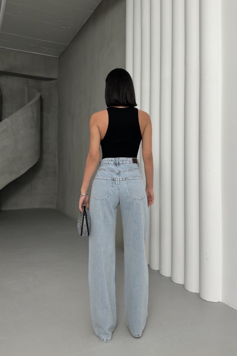 “Cep Kenarları Taş Detaylı ve Yüksek Belli Cepli Rahat Kot Kadın Pantolon Kar Yıkama Açık Mavi Denim” için yorum yapan ilk kişi siz olun