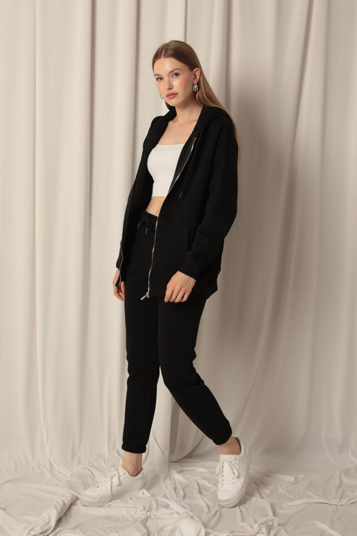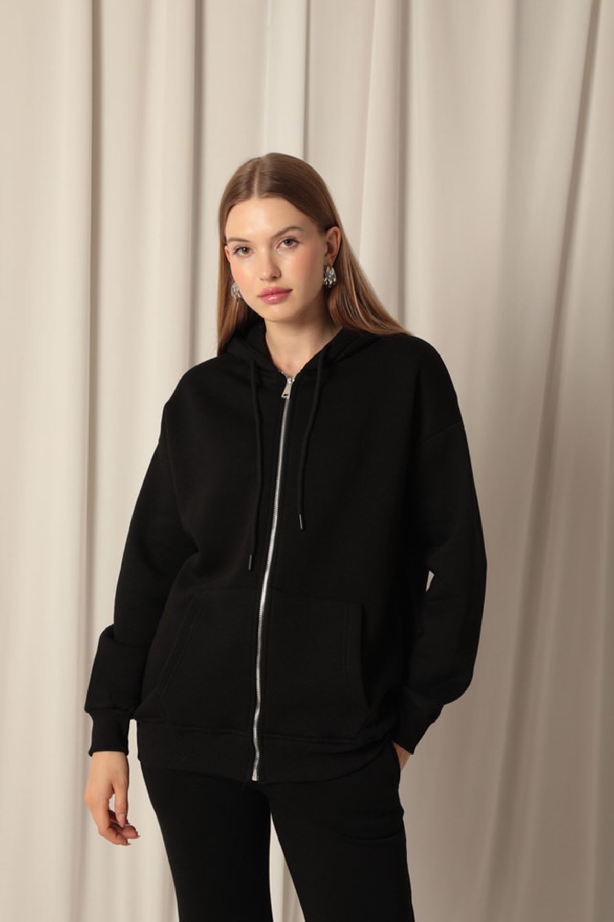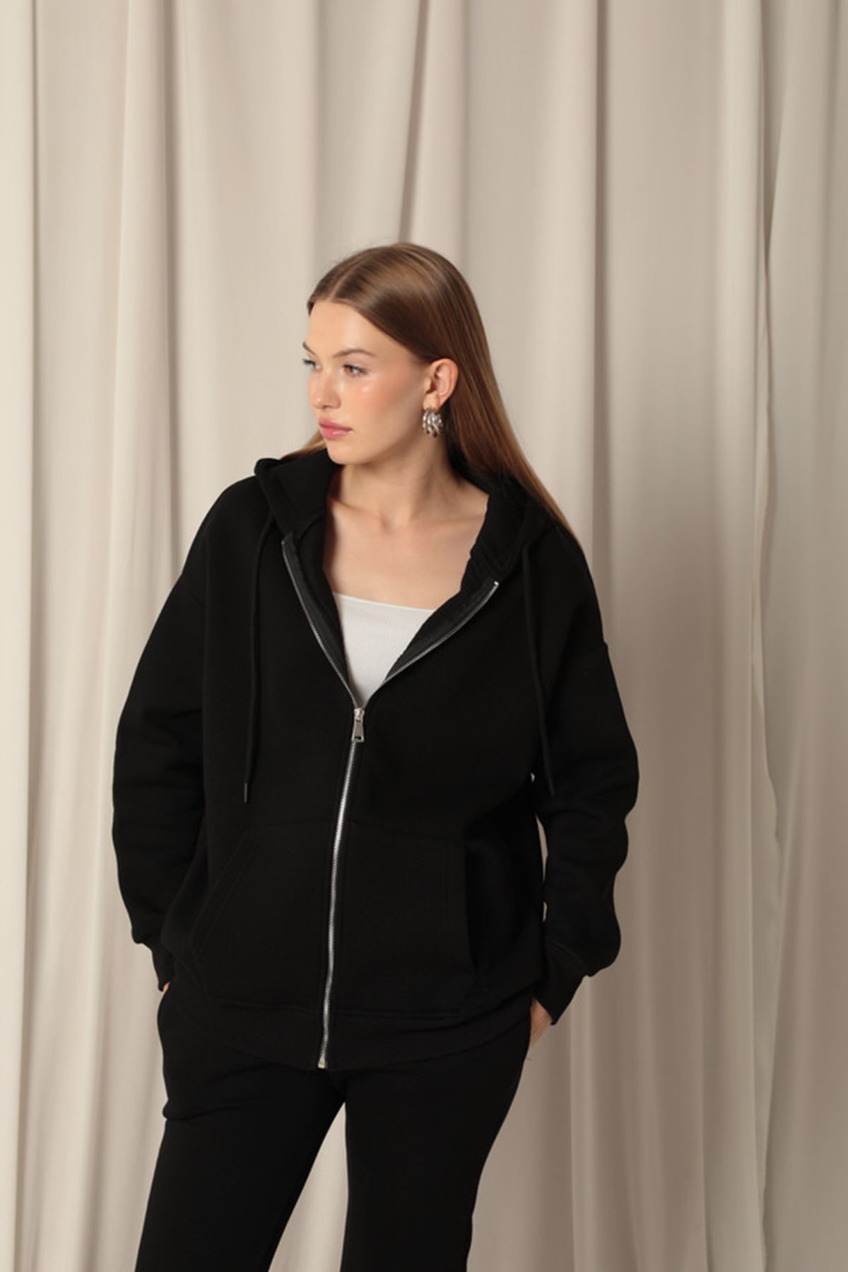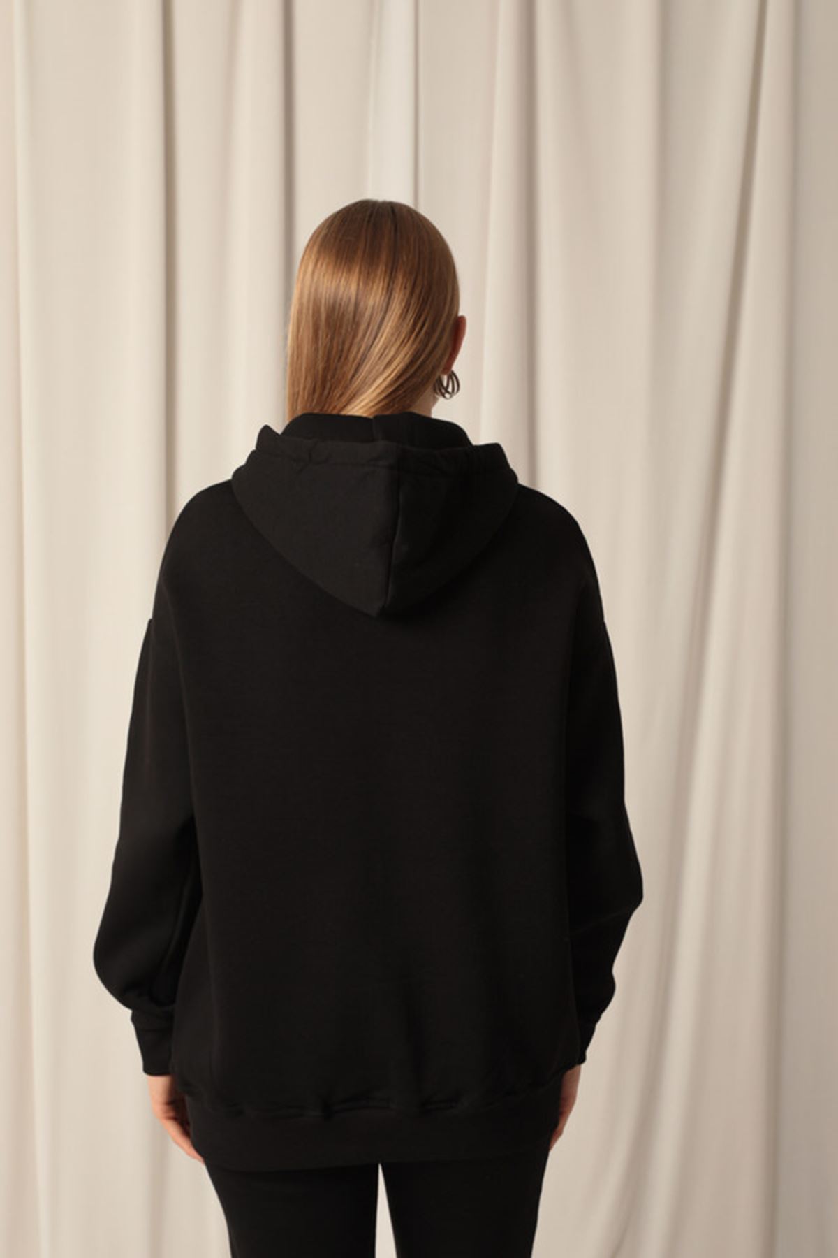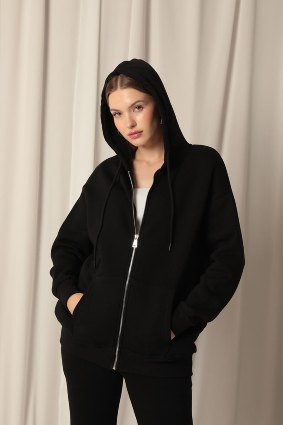 Kanguru Cepli ve Fermuar Detaylı Uzun Kollu Kapüşonlu Üç İplik Kumaşlı Kadın Sweat Siyah