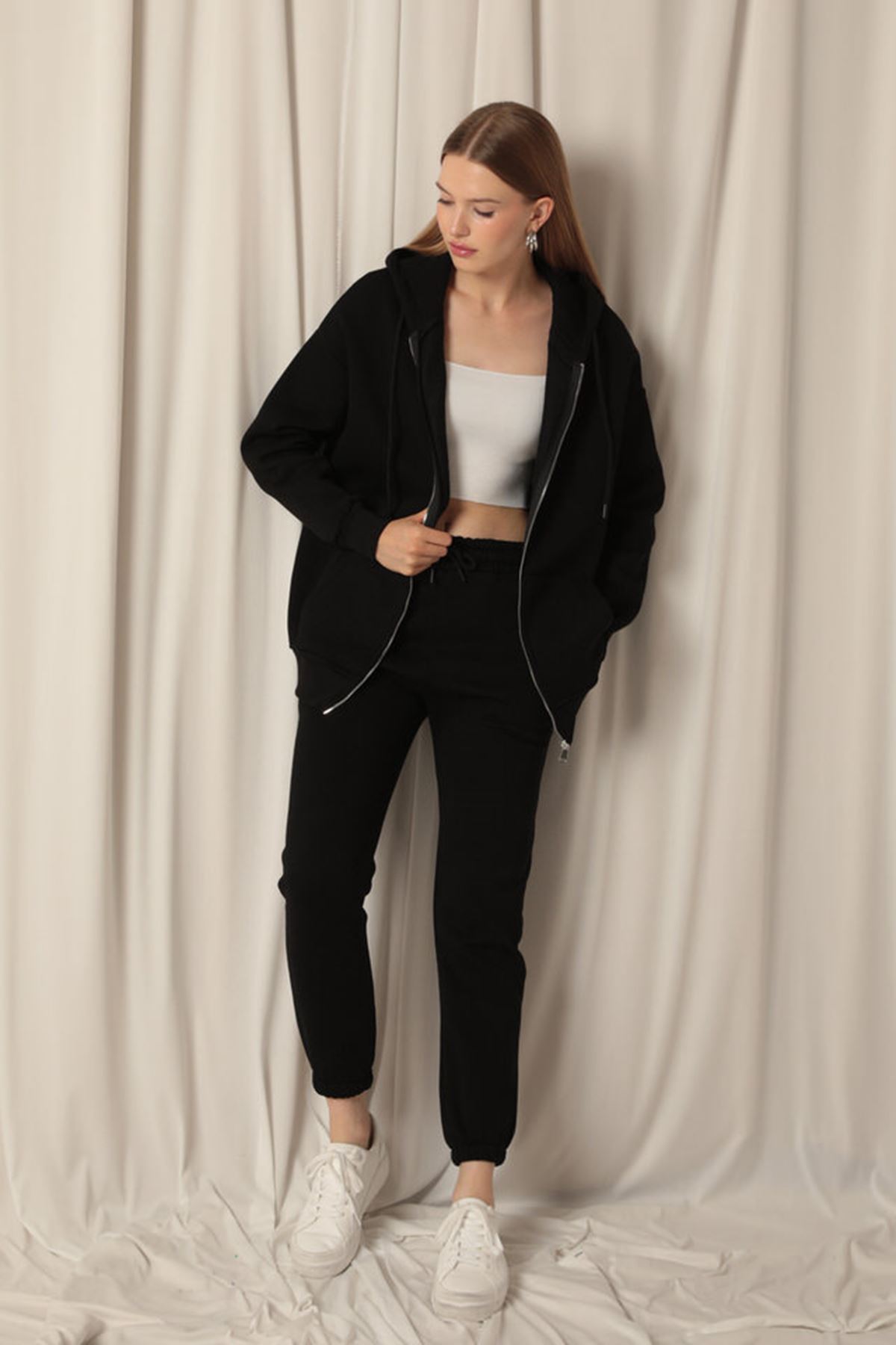 “Kanguru Cepli ve Fermuar Detaylı Uzun Kollu Kapüşonlu Üç İplik Kumaşlı Kadın Sweat Siyah” için yorum yapan ilk kişi siz olun