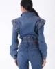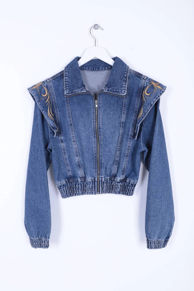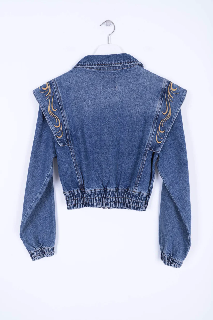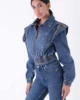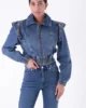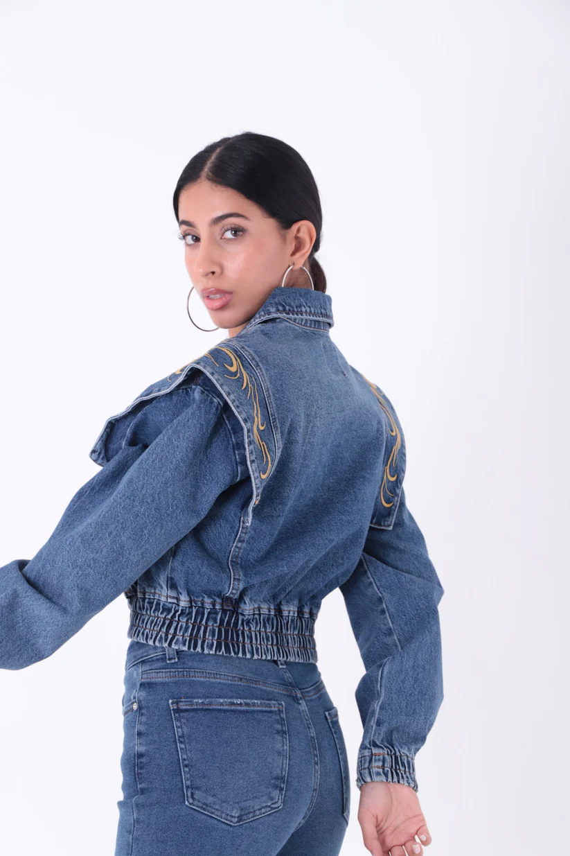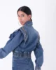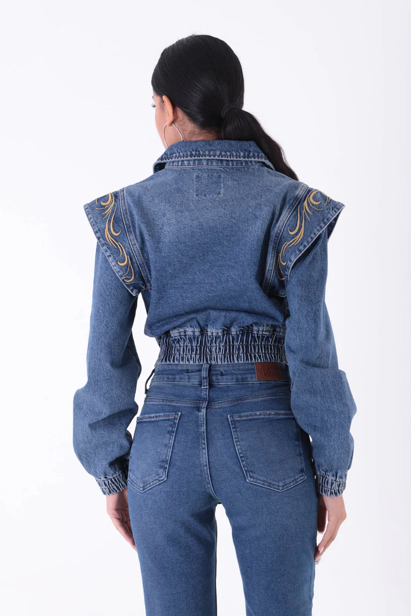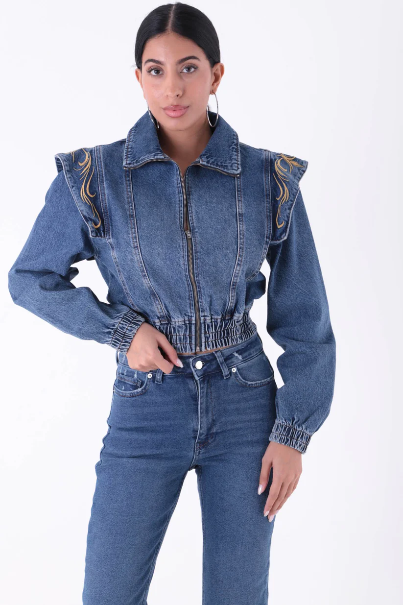 - RICHMOST Omuzları Nakışlı ve Fermuar Detaylı Cepsiz Astarsız Beli ve Kolları Lastiklli Kadın Kot Ceket Koyu Mavi Denim