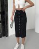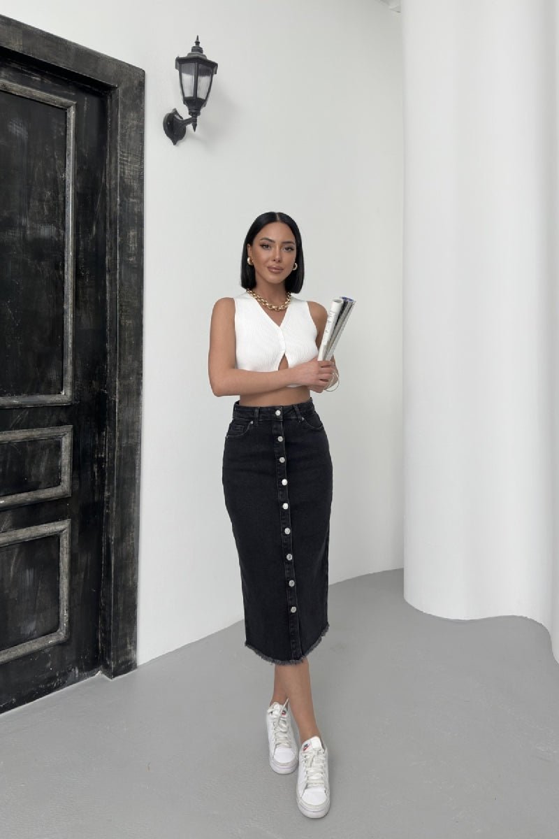 Önü Düğmeli ve Bitişi Püsküllü Cepli Kısa Boylu Kot Kadın Etek Normal Antrasit Denim Yaz / Bahar