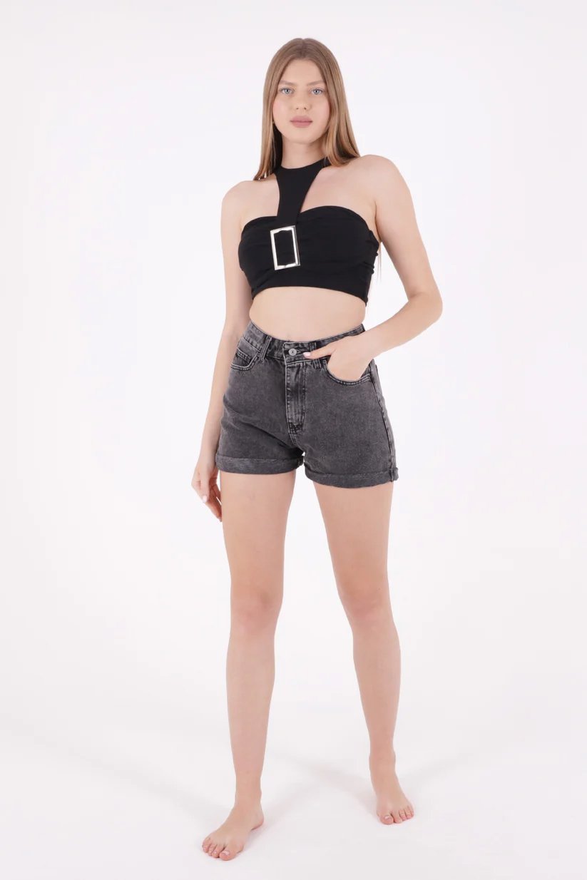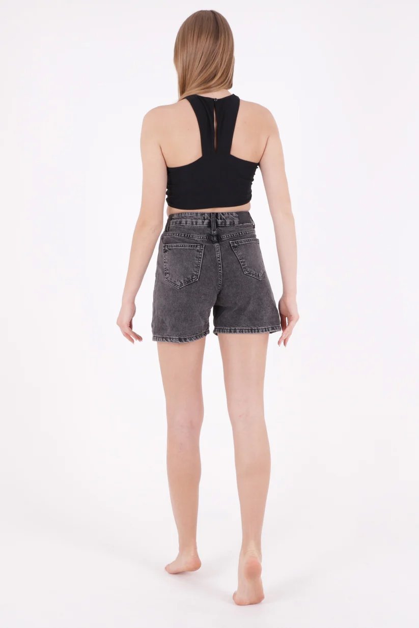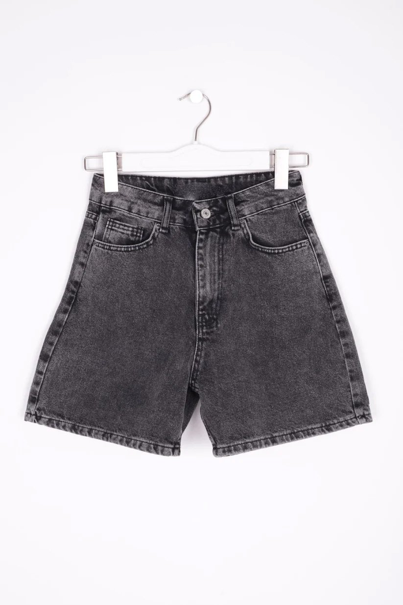 - RichMost Paçaları Çift Katlı Cepli ve Astarsız Mom Fit Kadın Kısa Kot Şort Kar Antrasit Denim