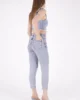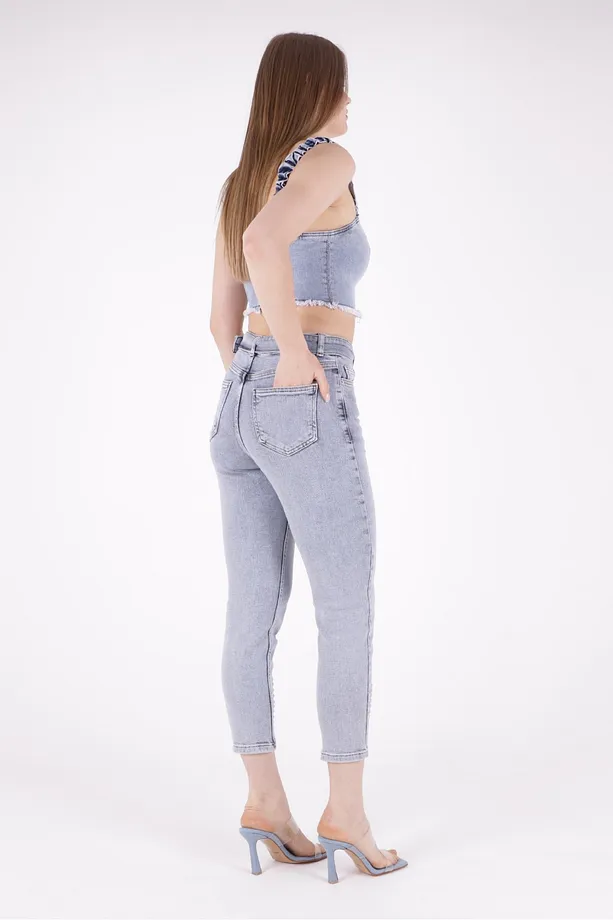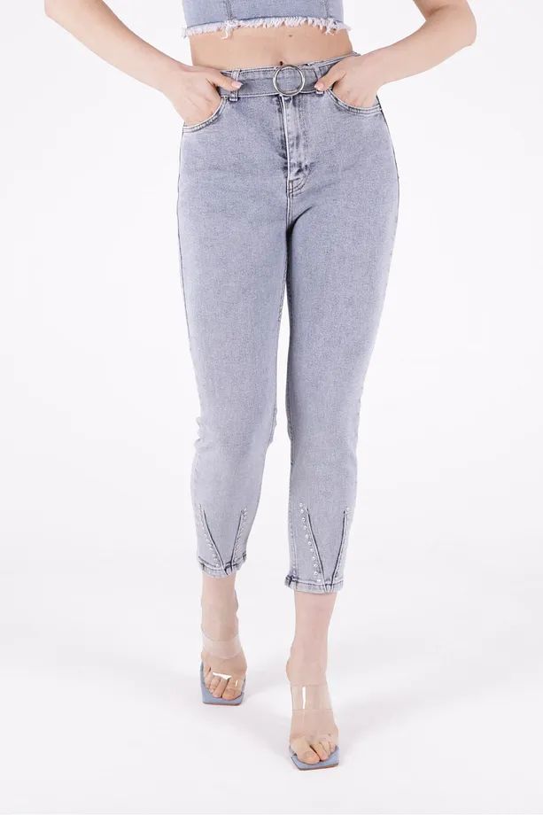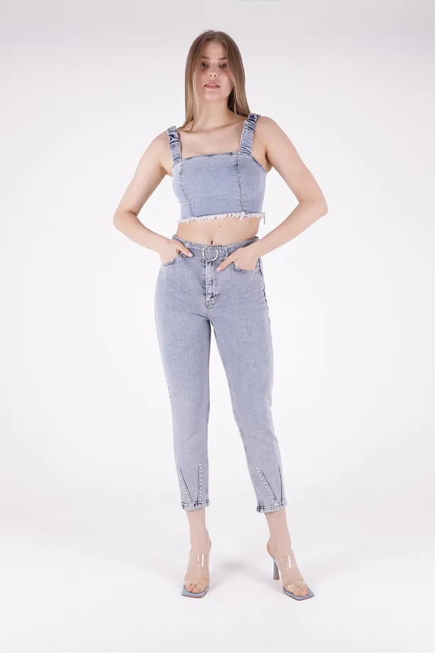 - RichMost Paçaları Dekoratif Damla Taşlı Yüksek Belli Cepli Bilek Boylu Kadın Kot Pantolon Kar Açık Mavi Denim