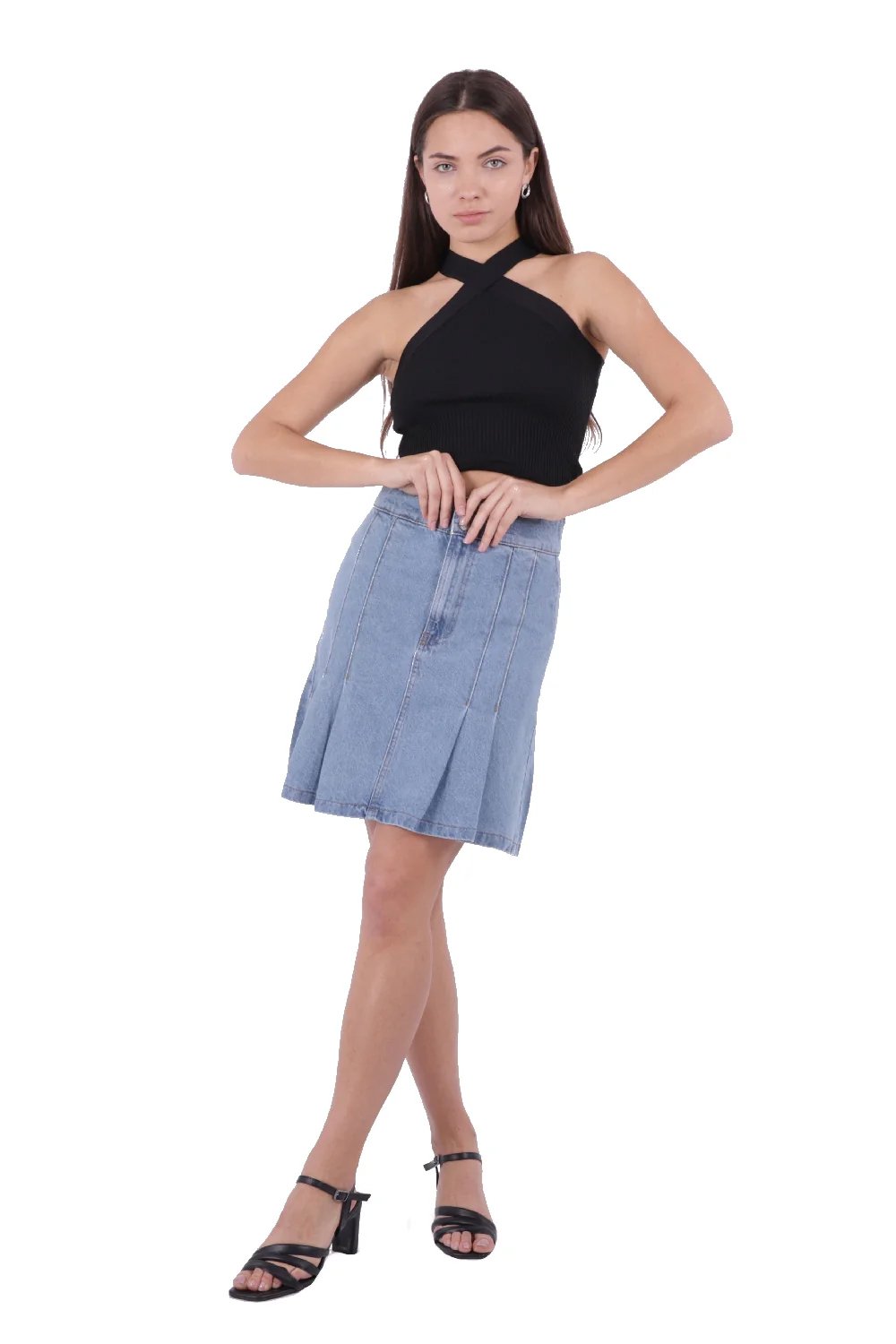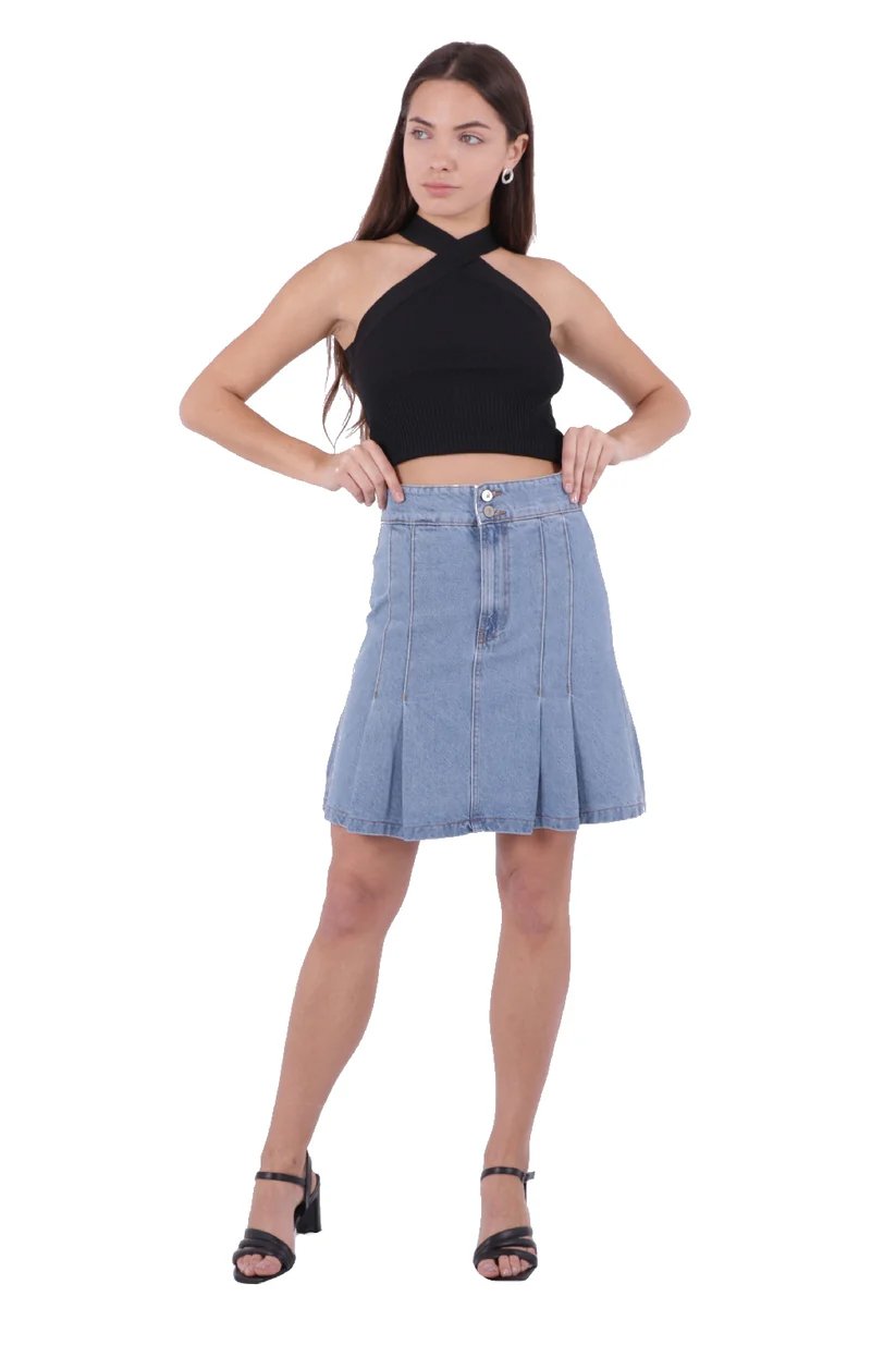 - RichMost Pileli Çan Modelli Cepsiz Astarsız Kadın Kısa Kot Etek Durulanmış Mavi Denim Yaz / Bahar