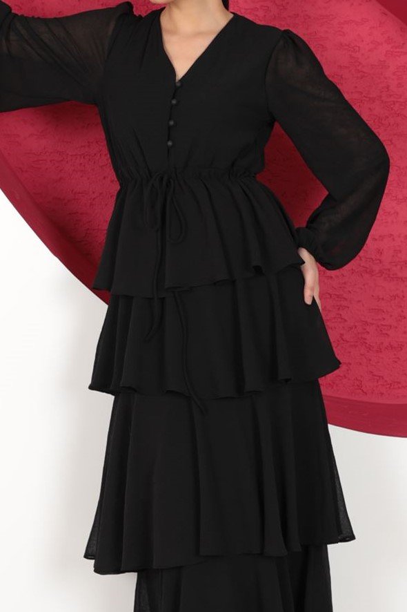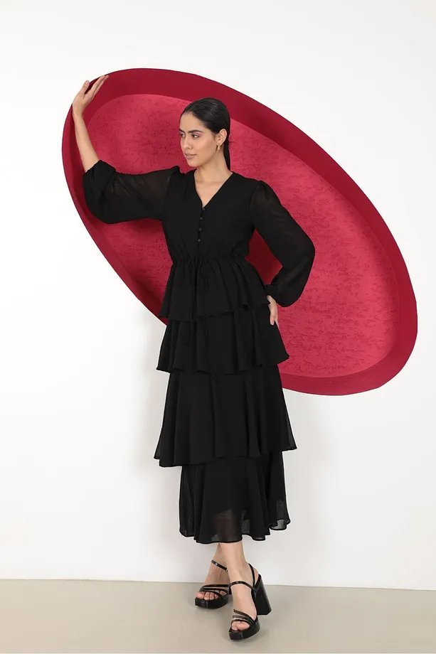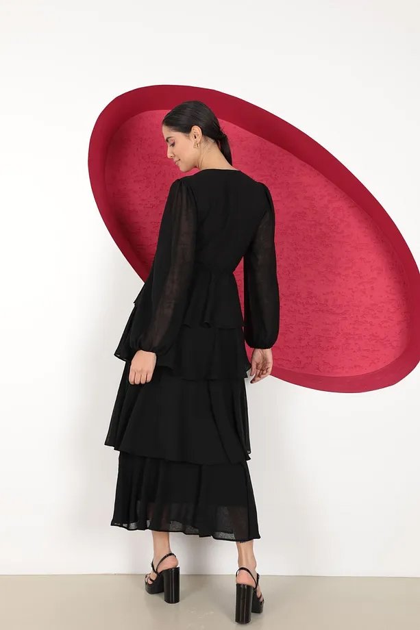 - RichMost Şifon Kumaşlı Desensiz ve Uzun Kollu O Yakalı Aerobin KatKat Kadın Elbise