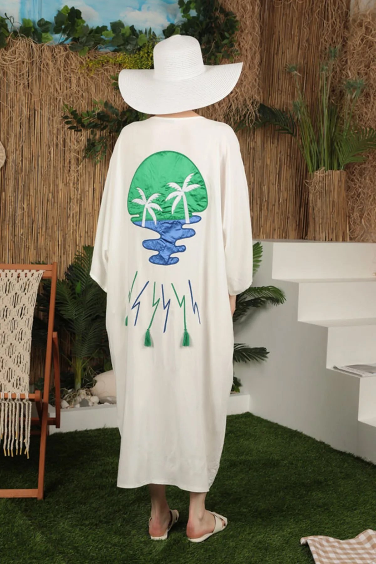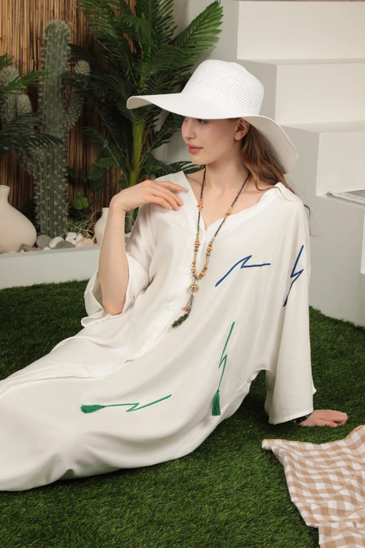 - RICHMOST Sırtı Nakış Detaylı V Yakalı ve Uzun Kollu Viskon Kumaşlı Bol Kalıplı Kadın Elbise Ekru Yaz / Bahar